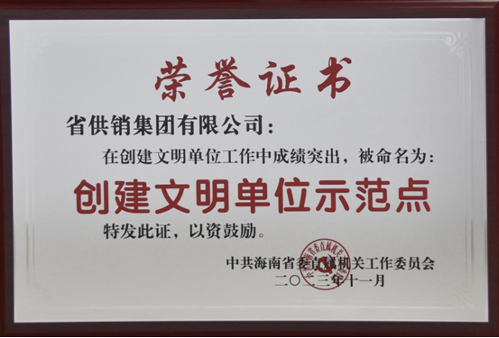 12月28日,中共海南省委直屬機關工作委員會頒發《創建文明單位示范點》榮譽證書,海南省供銷集團獲評為“創建文明單位示范點”單位。