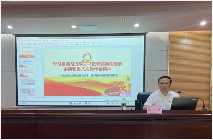 為推進(jìn)“能力提升建設(shè)年”活動(dòng)走深走實(shí),省供銷社搭建“海南供銷合作大講堂”平臺(tái),省社領(lǐng)導(dǎo)班子以上率下,鼓勵(lì)中層業(yè)務(wù)骨干、青年干部走上講臺(tái),以講促學(xué)提素能。6月10日下午,省供銷社黨組書記、理事會(huì)主任張志堅(jiān)圍繞學(xué)習(xí)貫徹習(xí)近平總書記考察海南重要講話和省第八次黨代會(huì)精神以持續(xù)深化供銷社綜合改革,更好服務(wù)海南自貿(mào)港建設(shè)為題,為省社領(lǐng)導(dǎo)班子成員、機(jī)關(guān)全體黨員、老干部支部黨員代表、省供銷集團(tuán)及社屬企業(yè)全體黨員上了一次專題黨課。