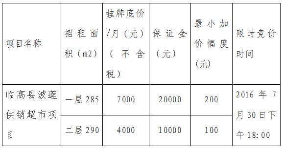 為切實(shí)加強(qiáng)供銷社社有資產(chǎn)管理,海南省供銷投資管理有限公司就臨高縣波蓮供銷超市項(xiàng)目面向社會(huì)進(jìn)行公開(kāi)招租。招租堅(jiān)持合法、公開(kāi)、公平、公正的原則,歡迎有關(guān)單位和個(gè)人參加競(jìng)標(biāo),現(xiàn)就招租有關(guān)細(xì)則如下: