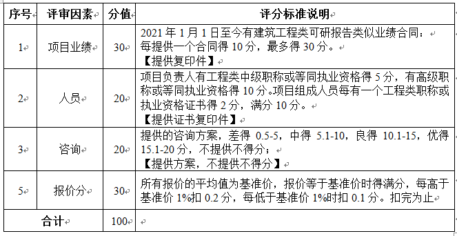 (五)比選本著公平、公正、科學(xué)、擇優(yōu)的原則,對比選文件進(jìn)行獨立評標(biāo)打分,按比選成員分值算術(shù)計算出的數(shù)值即為參選人的得分,依據(jù)參選人得分多少確定其排名次序。